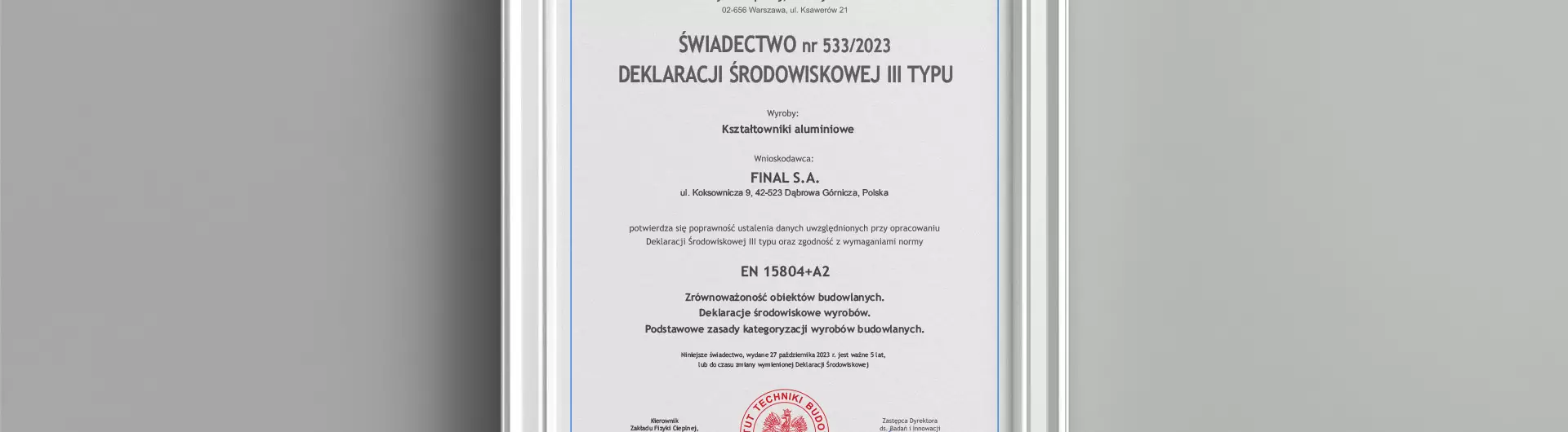 W dniu 27.10.2023 nasza firma, FINAL S.A., uzyskała Certyfikat określający ślad węglowy oferowanych przez Nas produktów. Certyfikat nr 533/2023 wydany przez Instytut Techniki Budowalnej potwierdza poprawność ustalenia danych z wymaganiami standardu EN 15084 przy opracowywaniu Deklaracji Środowiskowej III Typu dla naszych kształtowników aluminiowych.